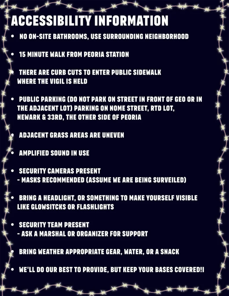 Organizers from the General Strike US have requested that everyone bring something that lights up, such as a flashlight, headlamp, glowsticks, photography lights, party lights etc. This vigil will be taking place at sunset and ending in the dark. The request is not only to make a night time gathering safer, but because this vigil is meant to both symbolically and literally shine a spotlight on the abuses that are happening inside that facility.